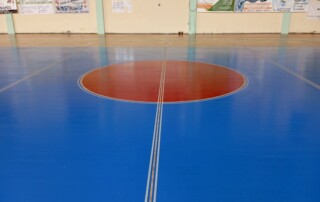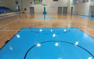 Coloring and line markings on parquet of indoor Basketball courts. Direct application of Alpha Epoxy Color K-2 on parquet and Acryl Desmo 2K varnish